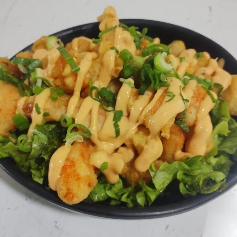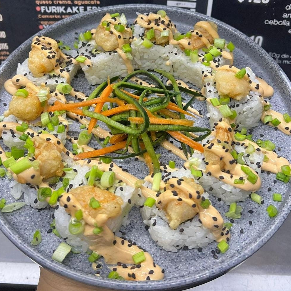 Surimi, queso crema y por fuera cubierta de aguacate con una mezcla de queso crema, trozos de camarón, cebollín y su aderezo spicy.
