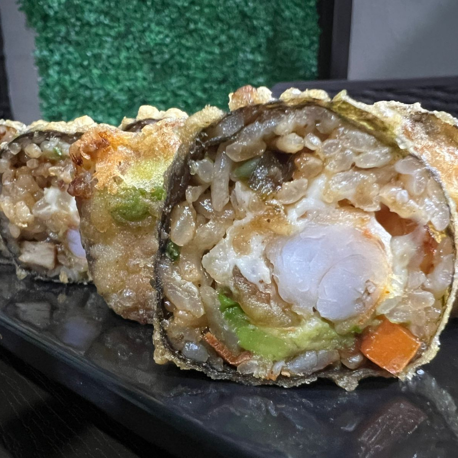 Por dentro con camarón tempura, queso crema, aguacate y base de arroz frito.