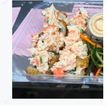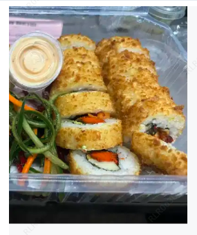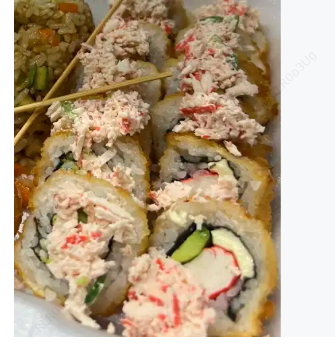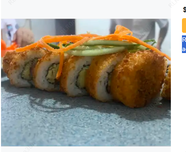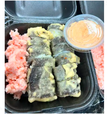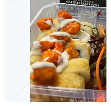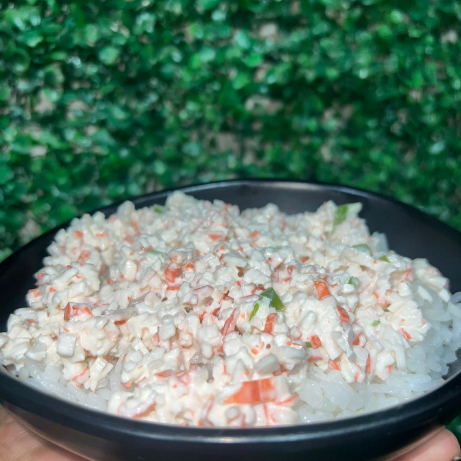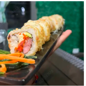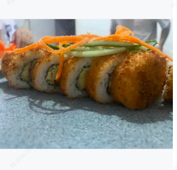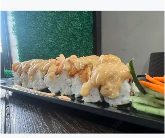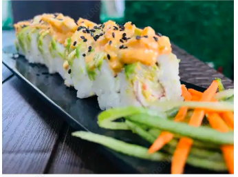 Surimi, queso crema y por fuera cubierta de aguacate con una mezcla de queso crema, trozos de camarón, cebollín y su aderezo spicy.