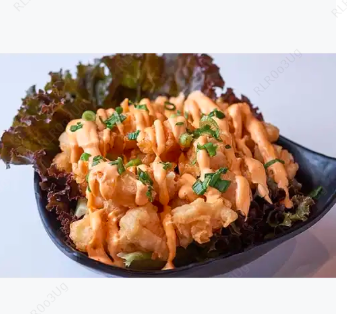 Camarones roca bañados en salsa chipotle con cebollín.