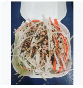 Ensalada de pepino, camarón y surimi acompañada de una vinagreta y especias de la casa.