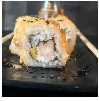 Rollo empanizado por dentro con camarón, queso crema y aguacate.