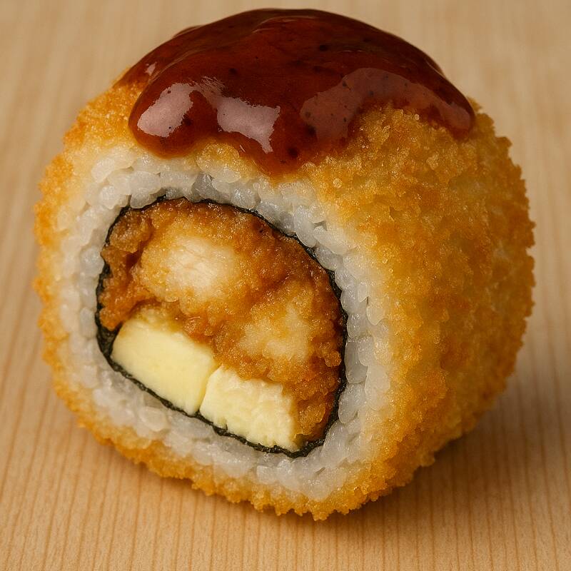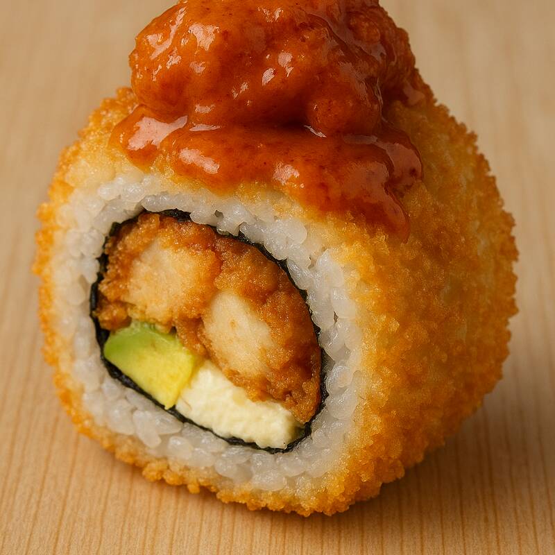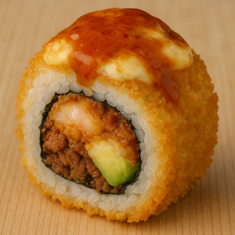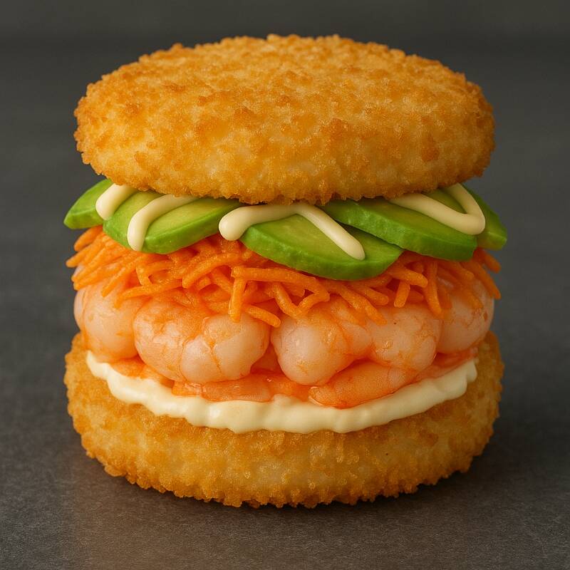 Base de queso crema, delicioso camarón empanizado, surimi, láminas de aguacate, mayonesa, limón y togarashi, todo esto entre 2 panes hechos de arroz empanizado con crujiente panko.