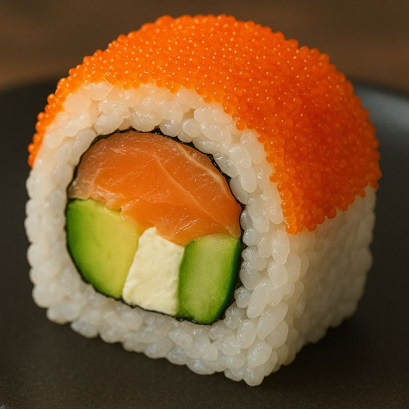 Salmón, pepino, queso crema por dentro y decorado con masago por fuera. Masago: huevas del pez.