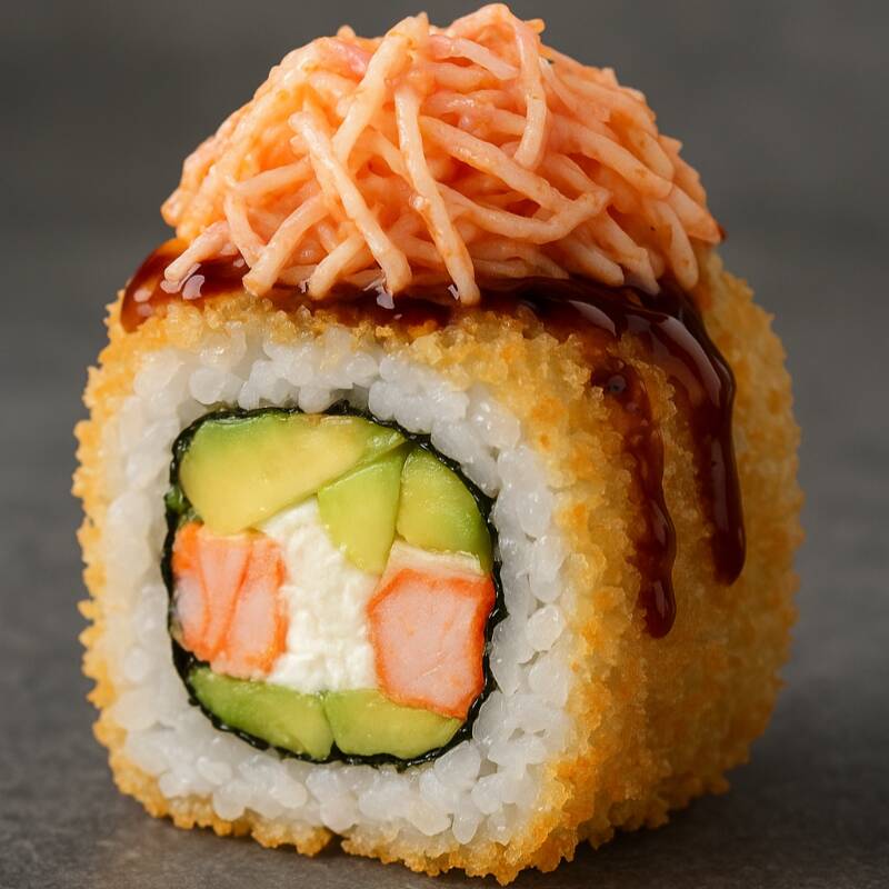 Camarón, aguacate y queso crema, empanizado y bañado en salsa de anguila.