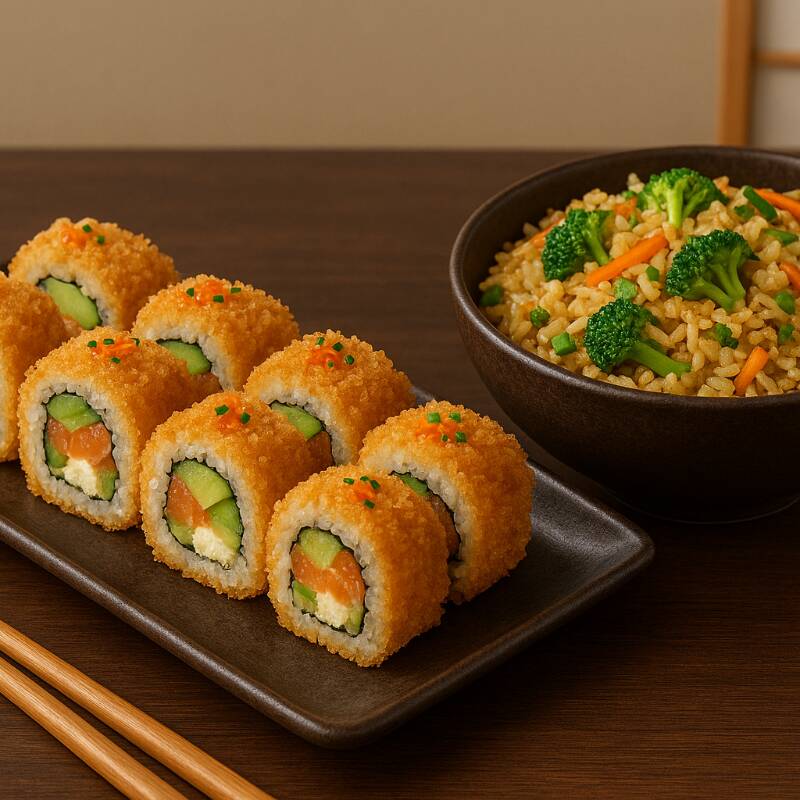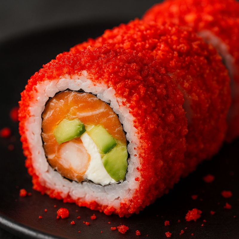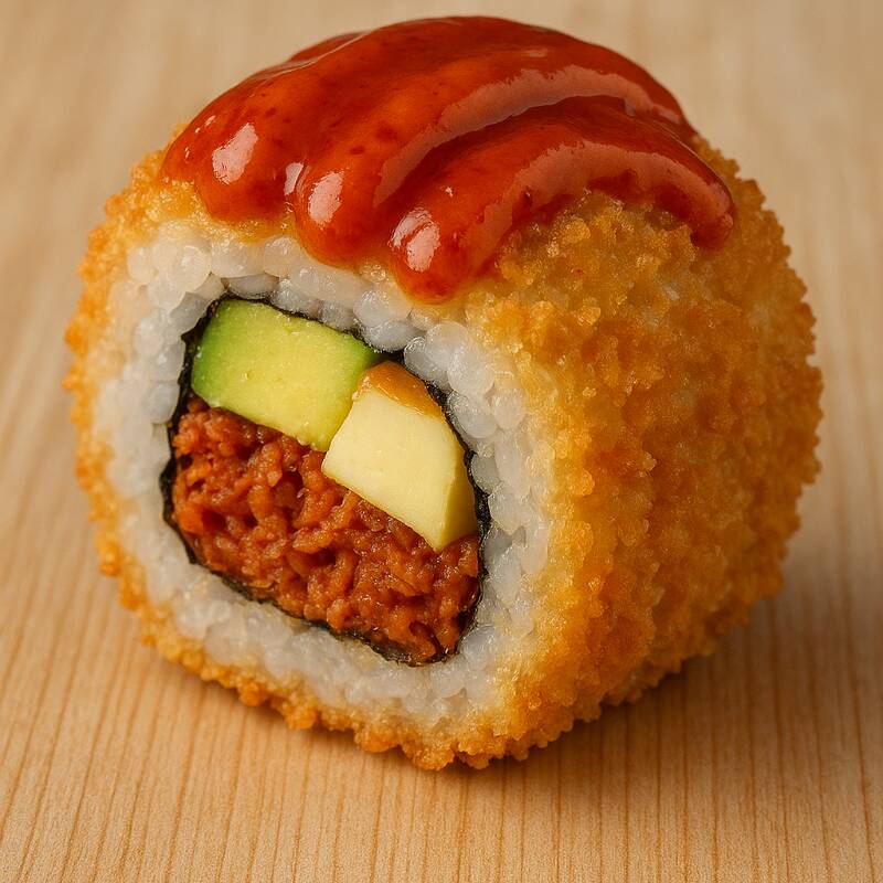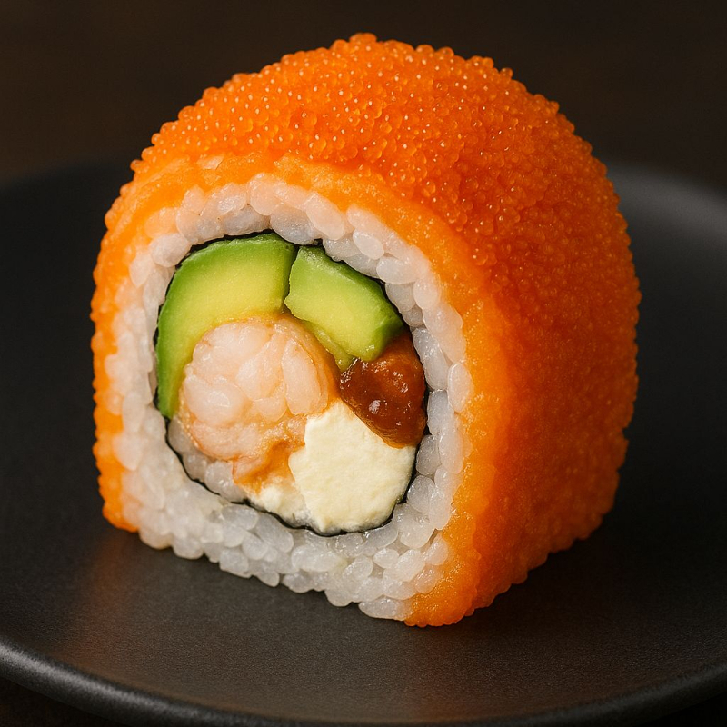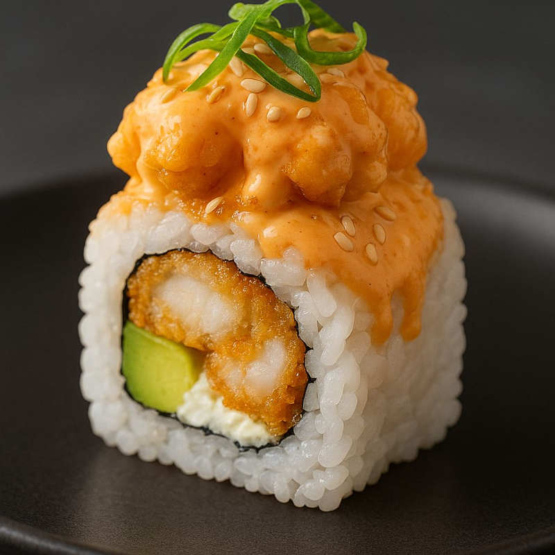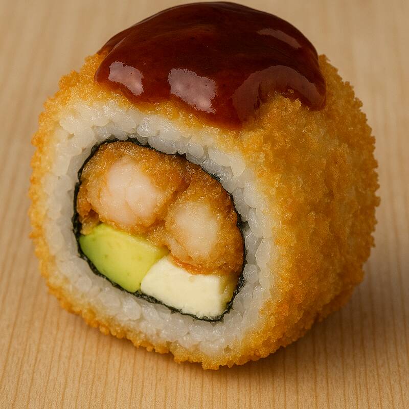 Camarón empanizado, aguacate y queso crema por dentro, decorado con camarón roca, cebollín y ajonjolí por fuera.