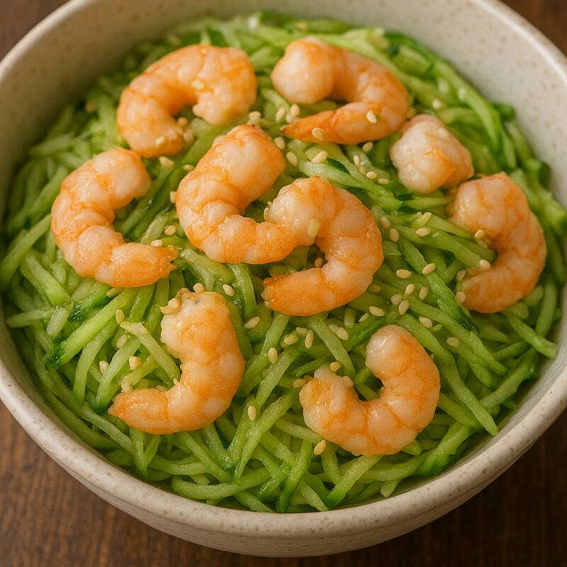 Pepino y camarón rallados. Chile serrano con cebolla y aceite de oliva.