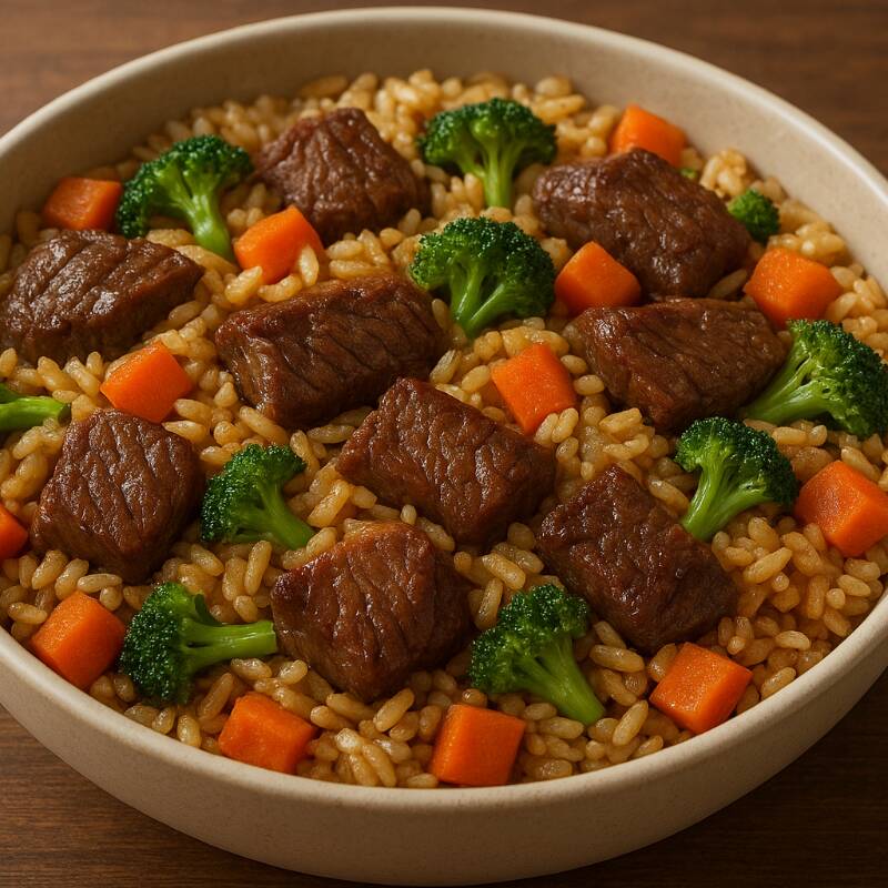 Arroz frito con verduras y carne arrachera oriental tamaño chico.