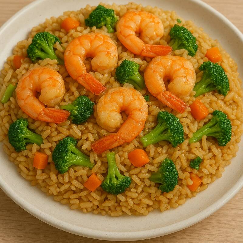 Arroz frito con verduras y camarón oriental tamaño grande.