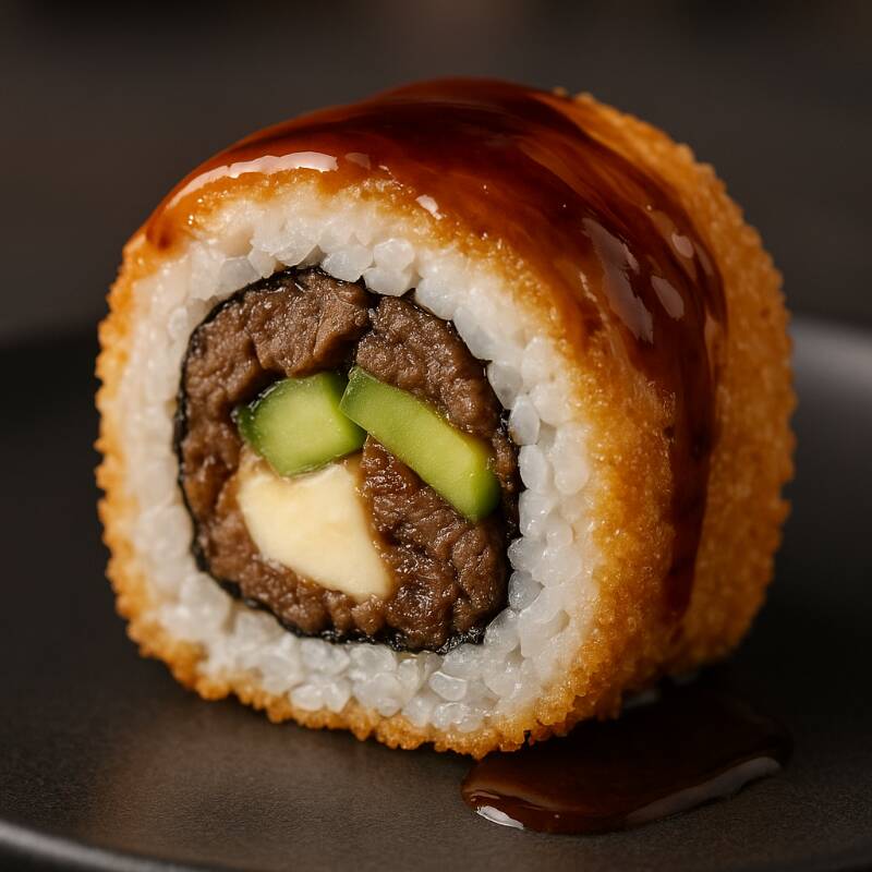 Por dentro carne arrachera, queso manchego y aguacate, empanizado y bañado en salsa de anguila.