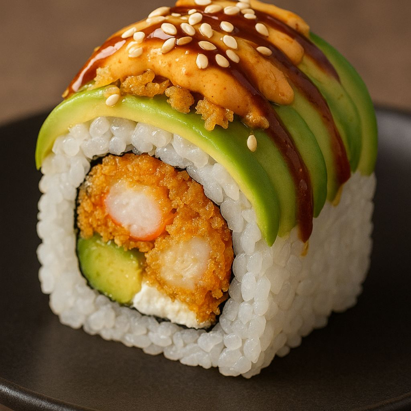 Surimi, pasta crunch y aderezo de chipotle por dentro y decorado por fuera con aguacate, pasta crunch, aderezo chipotle, salsa de Anguila y ajonjolí.