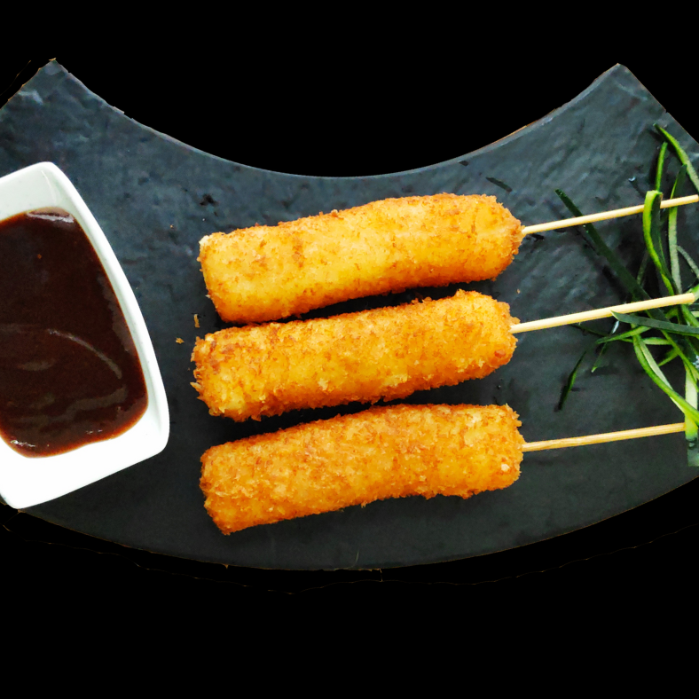Orden de 3 brochetas de queso empanizadas en panko japonés y fritas.