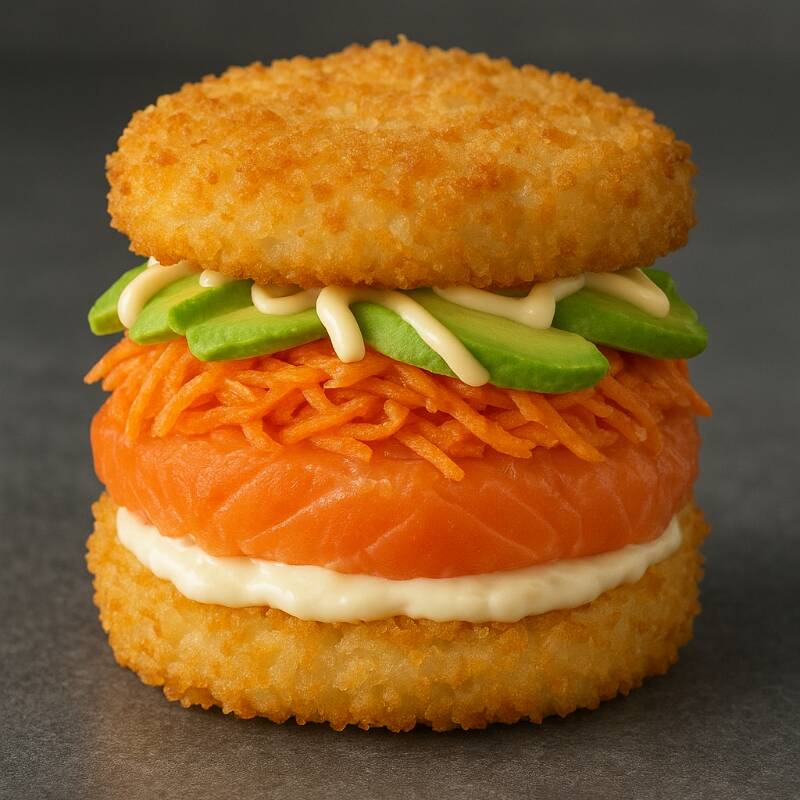 Base de queso crema, delicioso salmón, Tampico, surimi, láminas de aguacate, mayonesa, limón y togarashi, todo esto entre 2 panes hechos de arroz empanizado con crujiente panko.