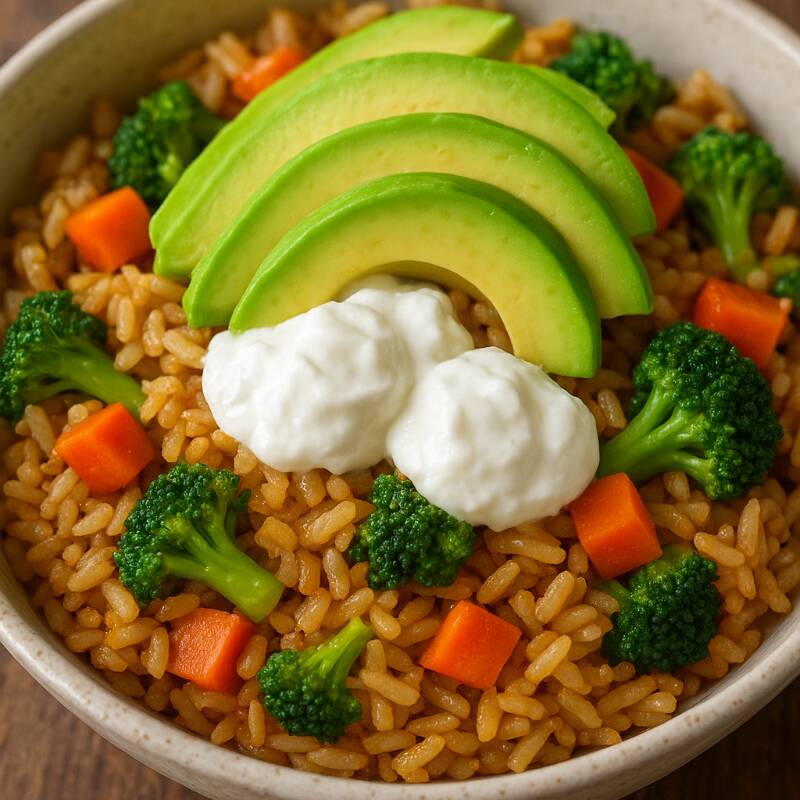 Arroz frito decorado con queso crema y aguacate tamaño chico.
