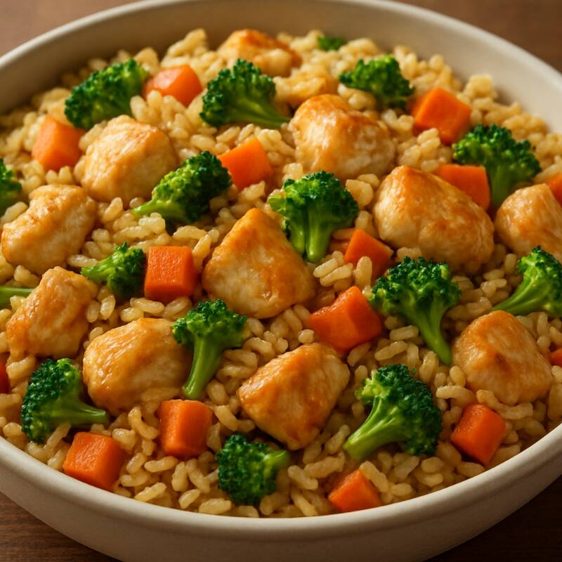 Arroz frito con verduras y pollo oriental tamaño chico.