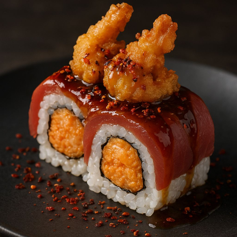 Relleno de pasta Tampico, forrado con láminas de atún fresco y camarones capeados, bañado en salsa de anguila y nuestra mezcla de chiles secos.