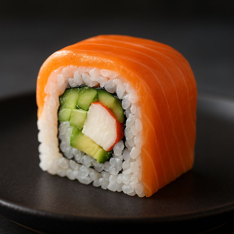 Surimi, queso crema, aguacate y pepino por dentro, decorado con delicioso salmón por fuera.