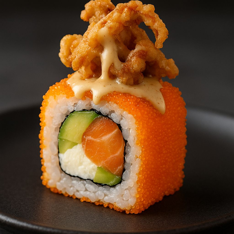 Salmón, queso crema y aguacate por dentro, decorado por fuera con masago y una torre de surimi frito bañado con aderezo ranch serrano.