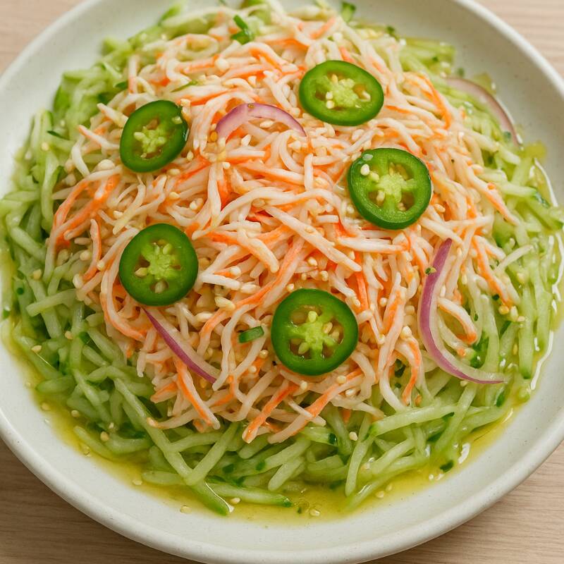 Pepino y surimi rallados. Chile serrano con cebolla y aceite de oliva.