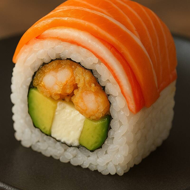Camarón, queso crema y aguacate por dentro, decorado con salmón y surimi por fuera.