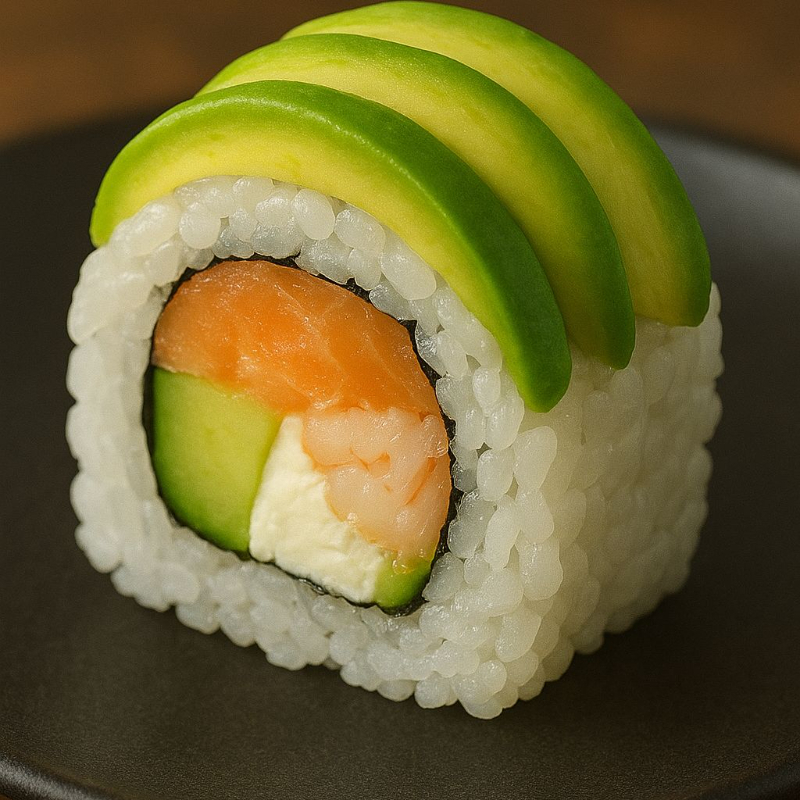 Por dentro camarón, queso crema y pepino, decorado con aguacate por fuera.