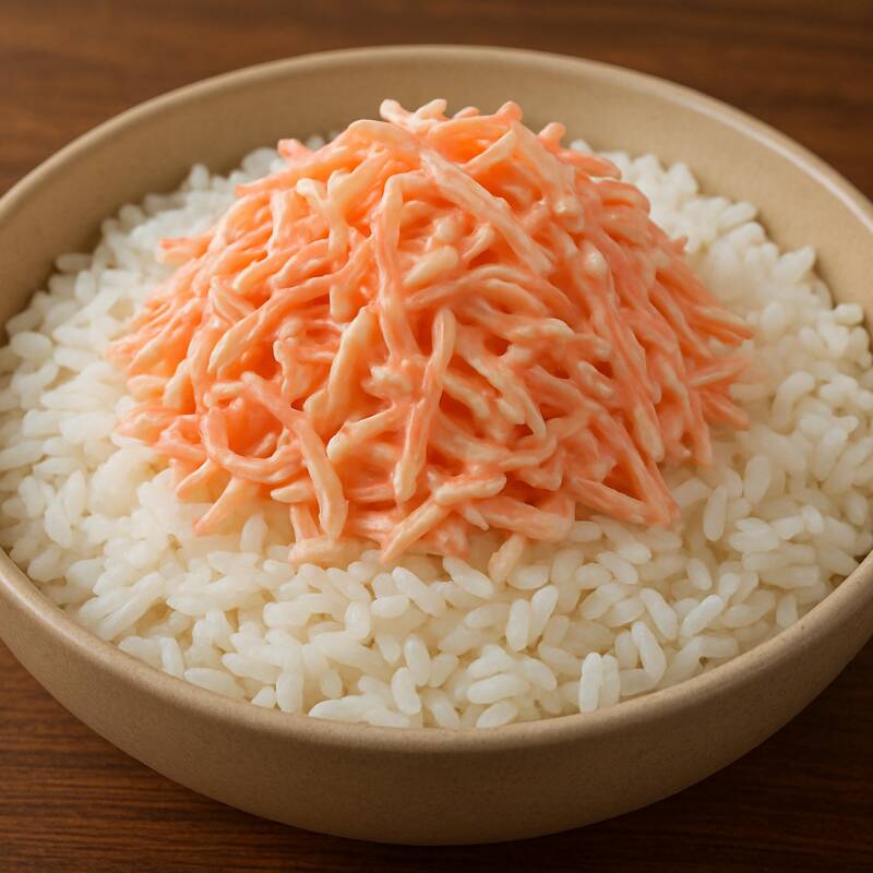 Arroz blanco al vapor decorado con pasta Tampico (surimi) tamaño chico.
