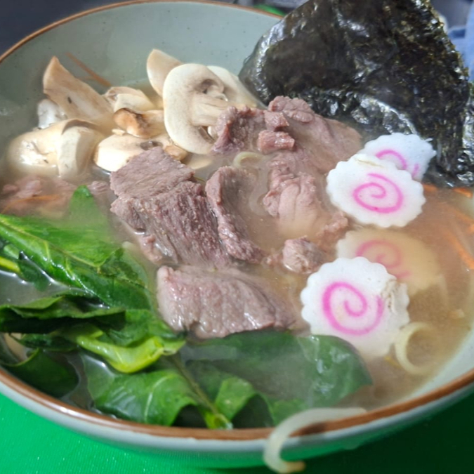 espinacas, 1/2 huevo, germen de soya, alga marina,champiñon, cebollin y naruto