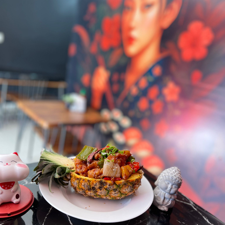 Un arroz mixto, pollo carne y cmaron, un sushi a elegir y dos dedos de queso manchego