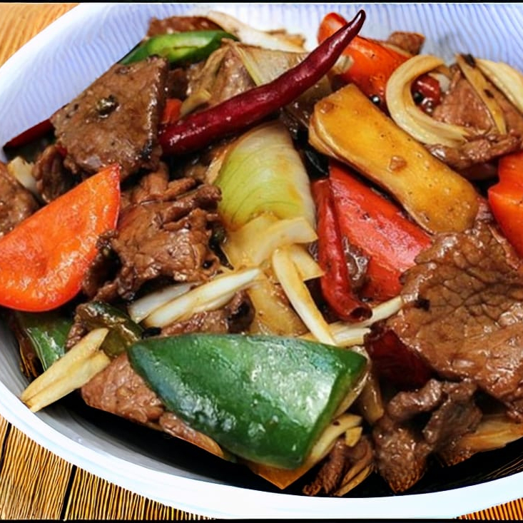 brocgetas de res, con morron verde, morron rjo y cebolla blanca en una salsa de ostion