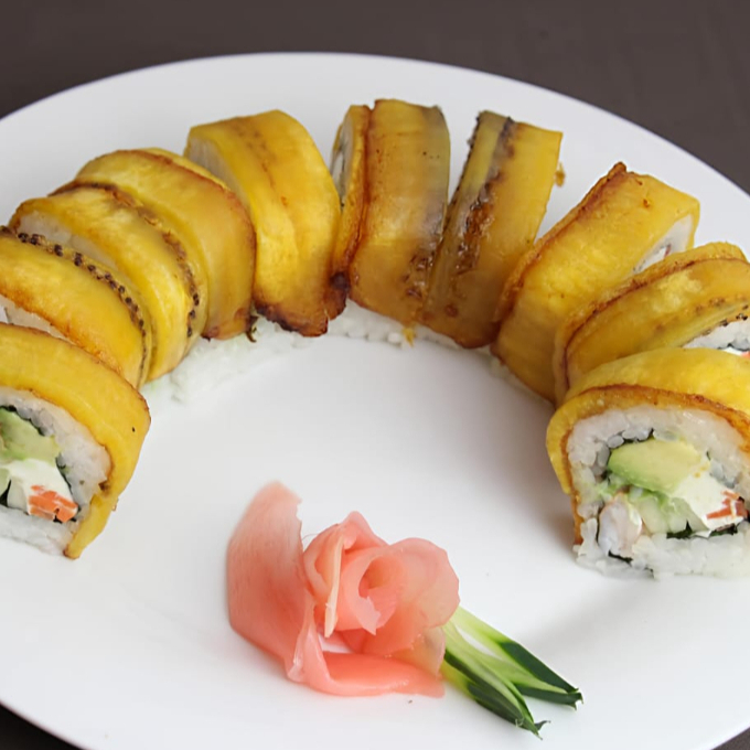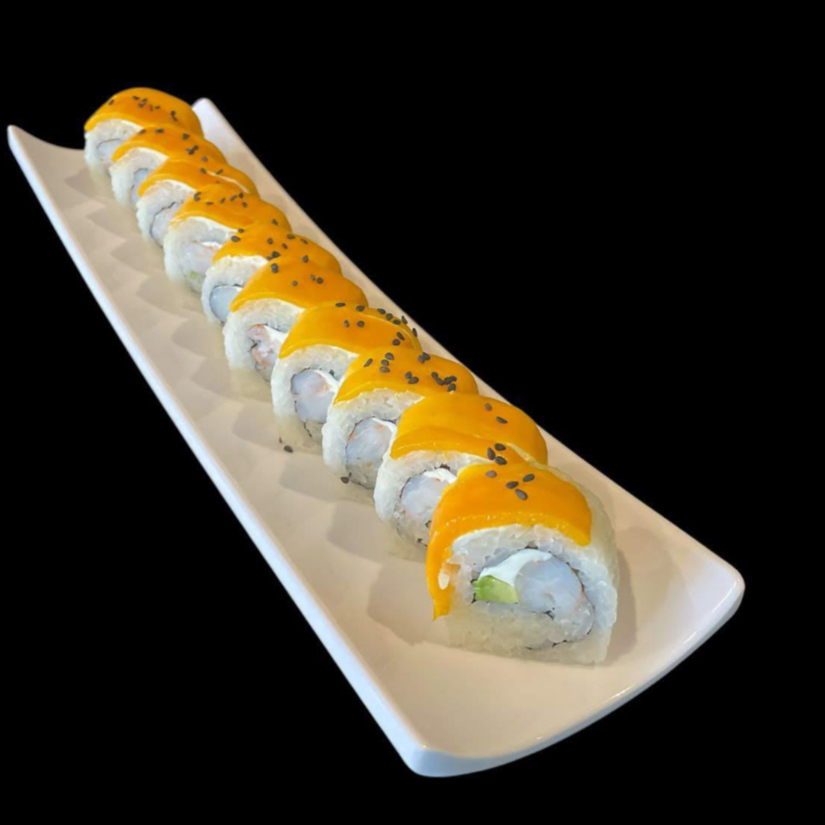 aguacate surimi friti y pepino, por fuera mango (rollo frio )