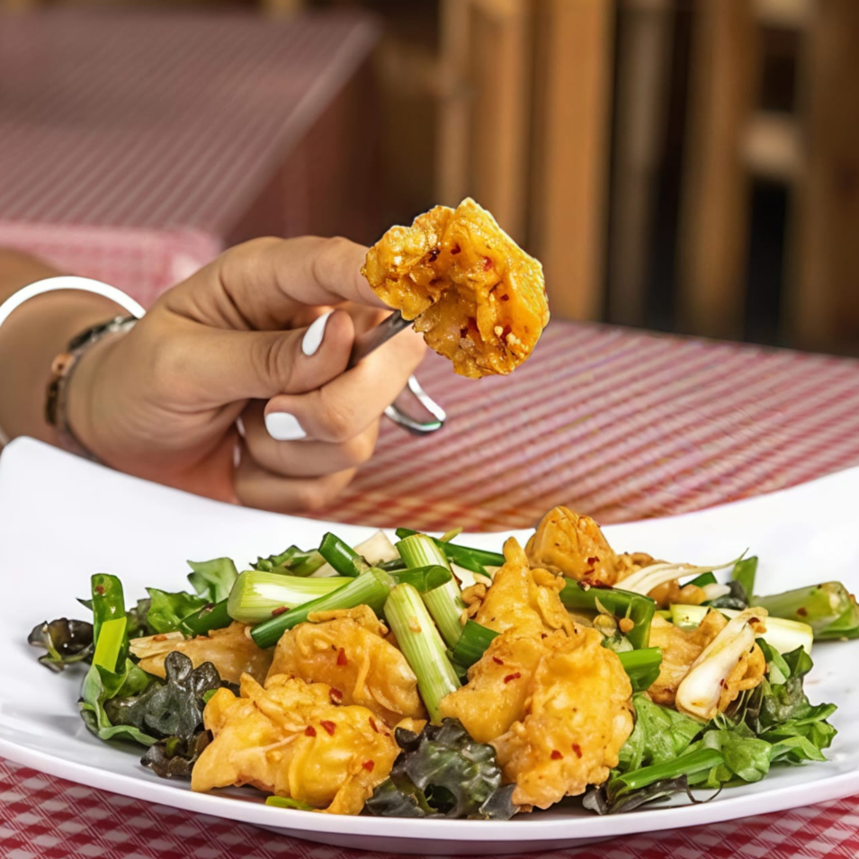 camarones capeados,salteados en su salsa spyci con una bace de lechuha
