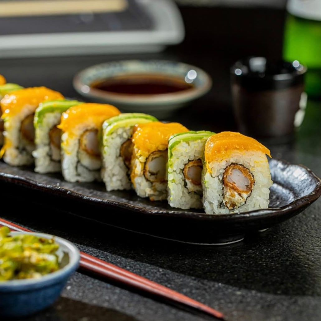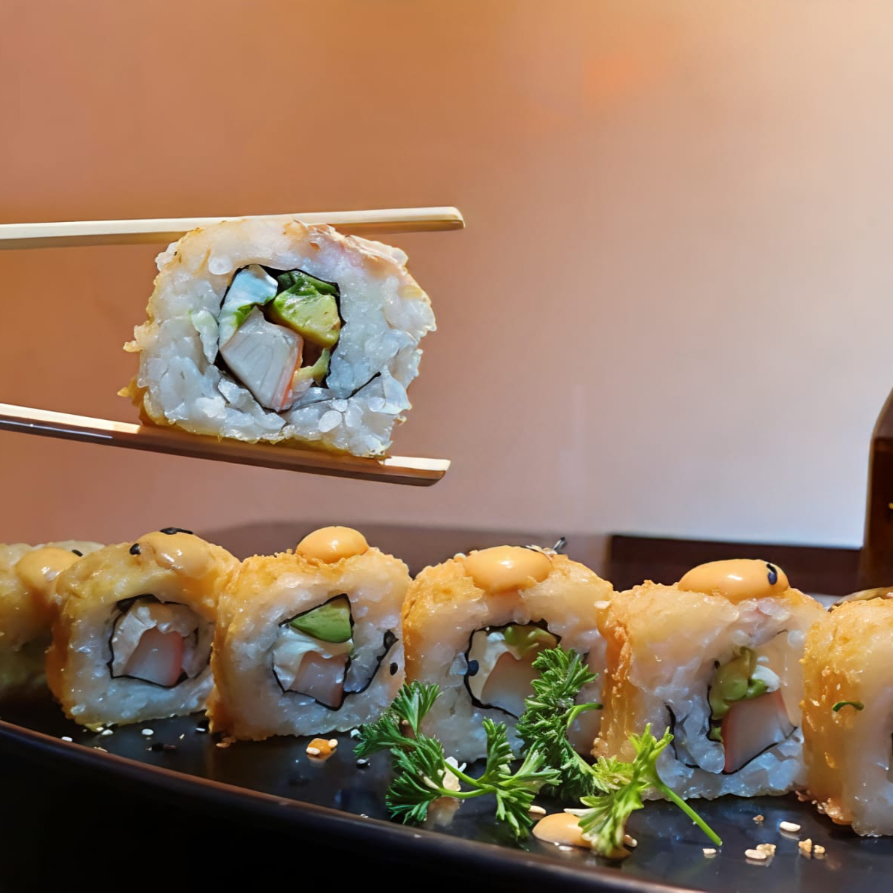 aguacate, arrachera y queso manchego (rollo caliente) por fuera adereso chipotle