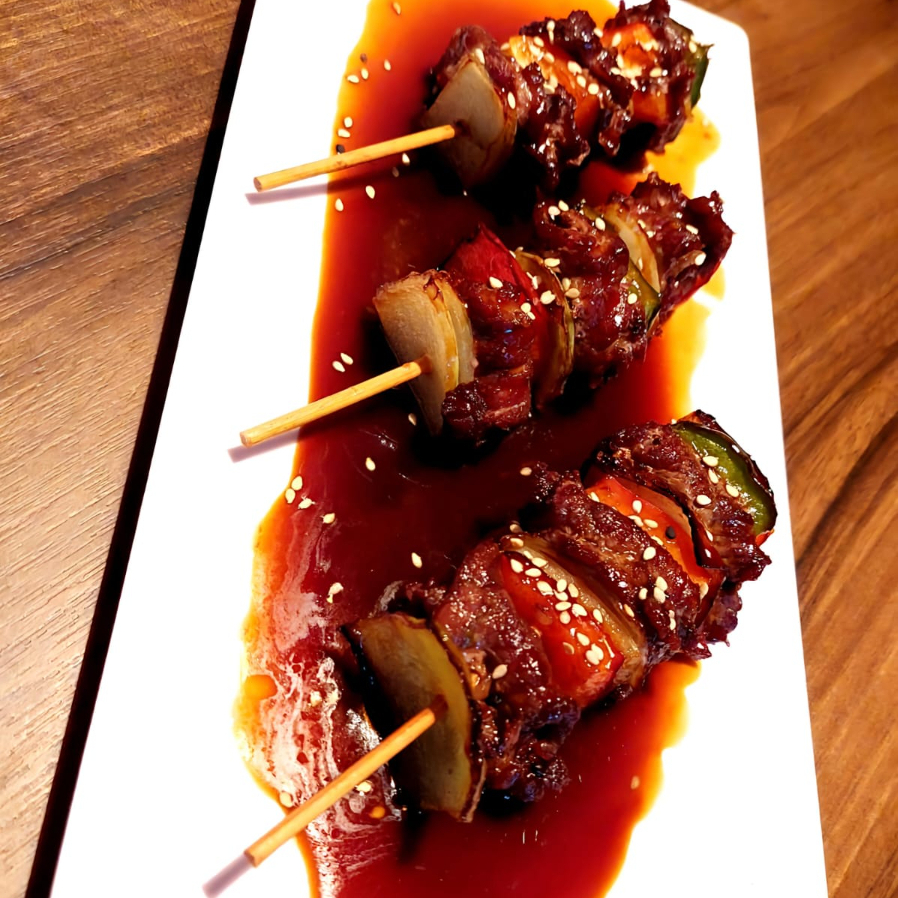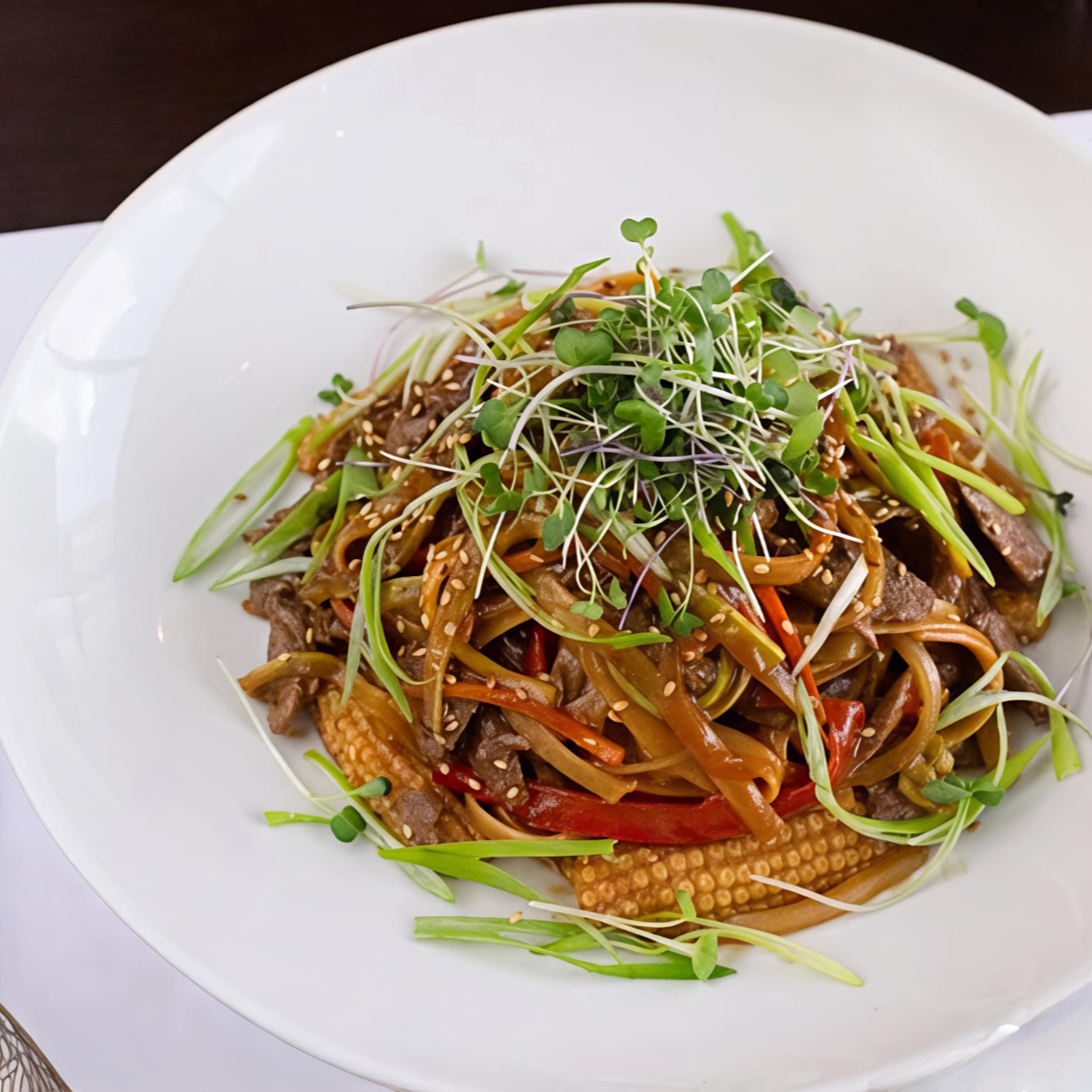 arrachera, elotitos, brocoli, cebolla cambray y chile de arbo en una salsa picosita }