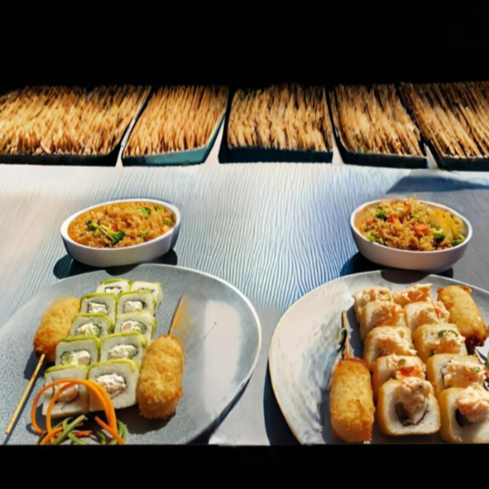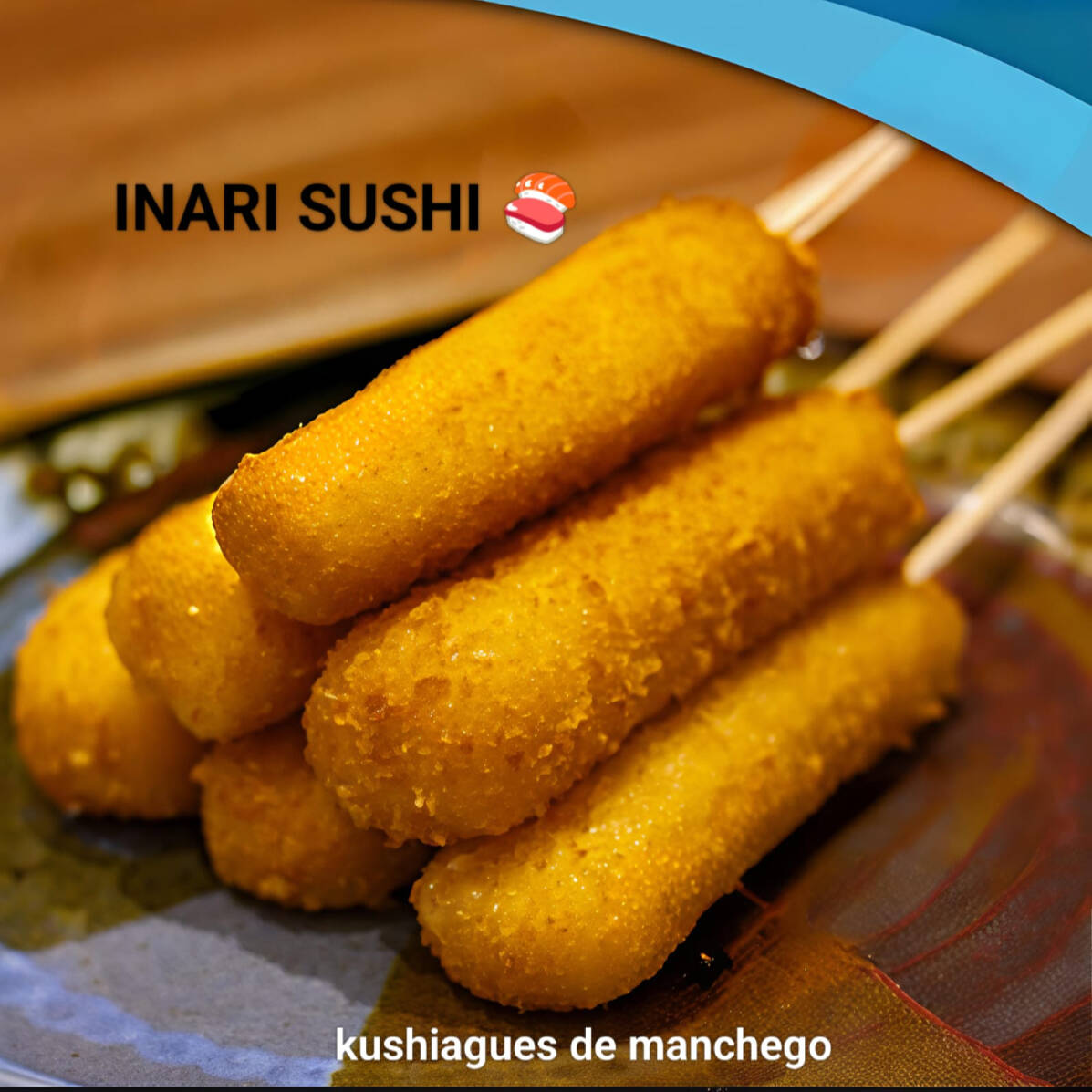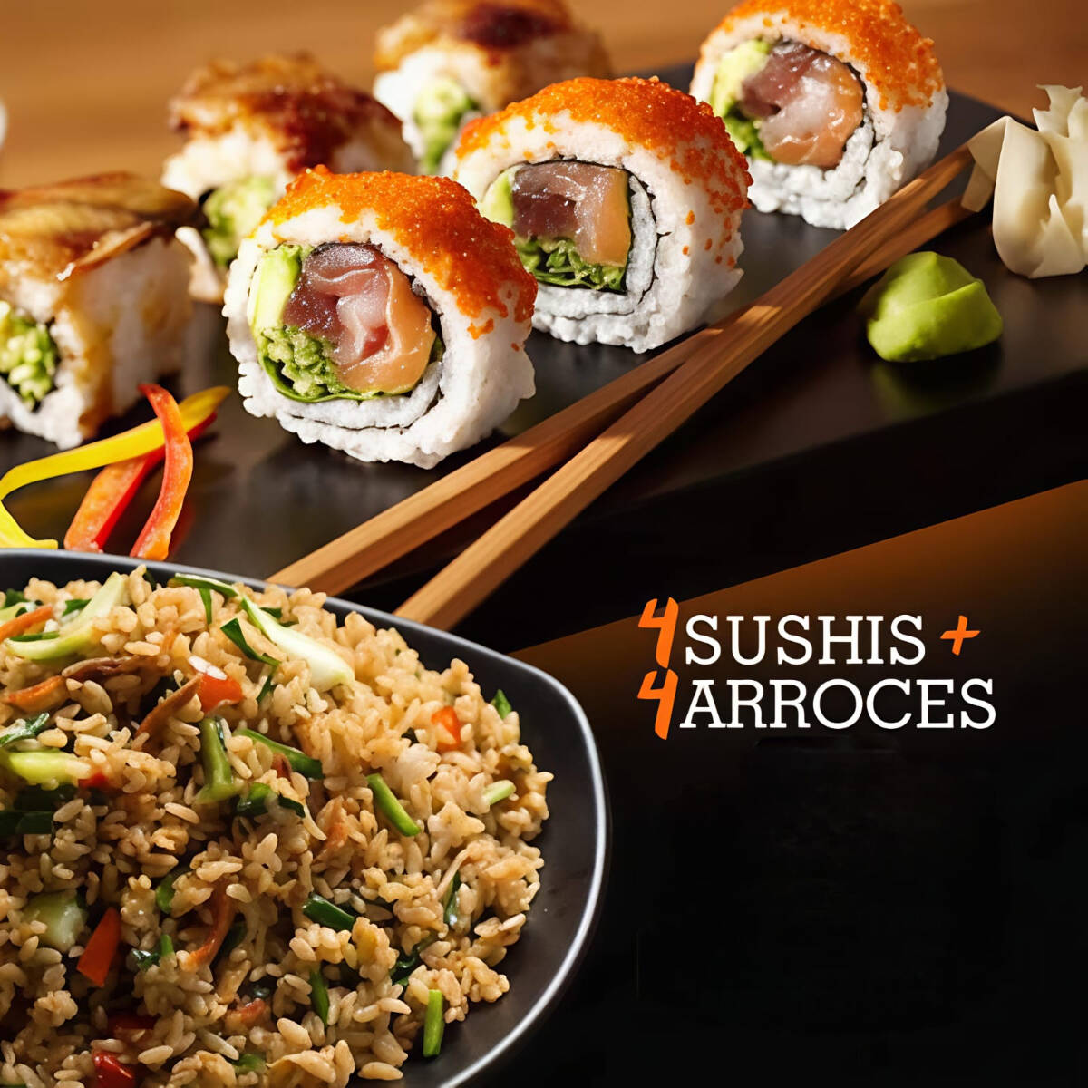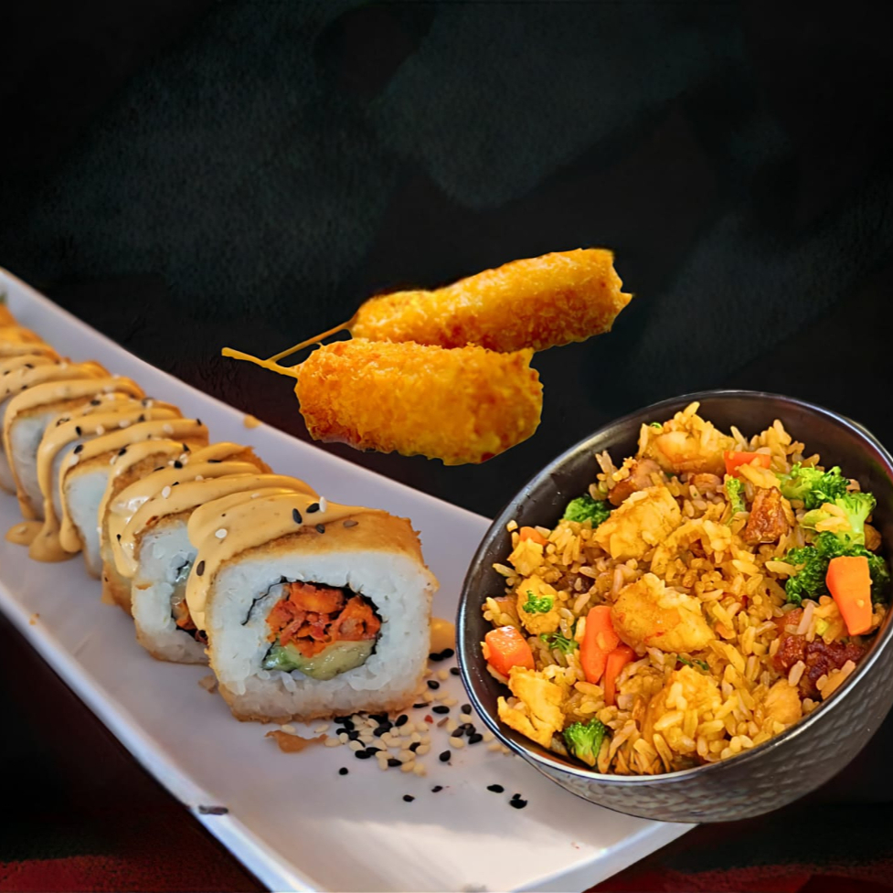 dos arroses fritos verdura, dos sushis a elegir mas cuatro dedos de queso manchego