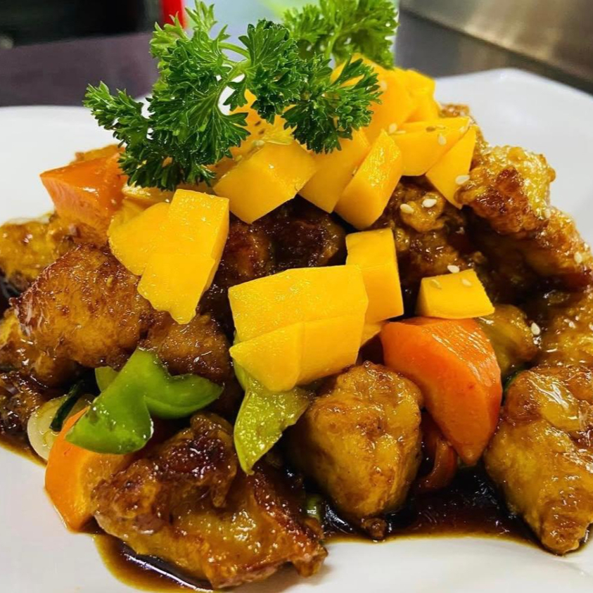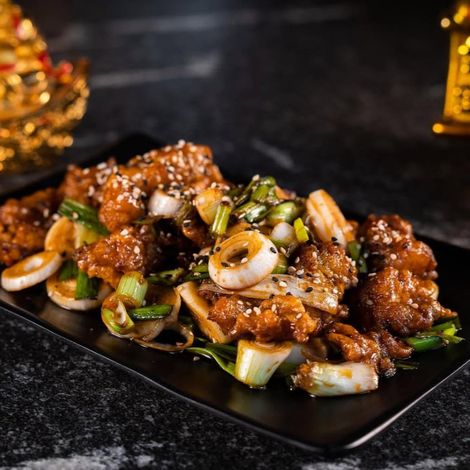 trozos de pollo capeado, con ceboplla cambray en una salsa hunan