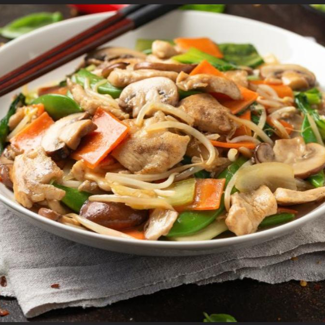 pollo, carne, camaron, elotitos tiernos, champiñiones, en salsateriyki