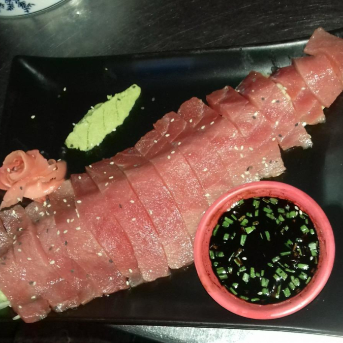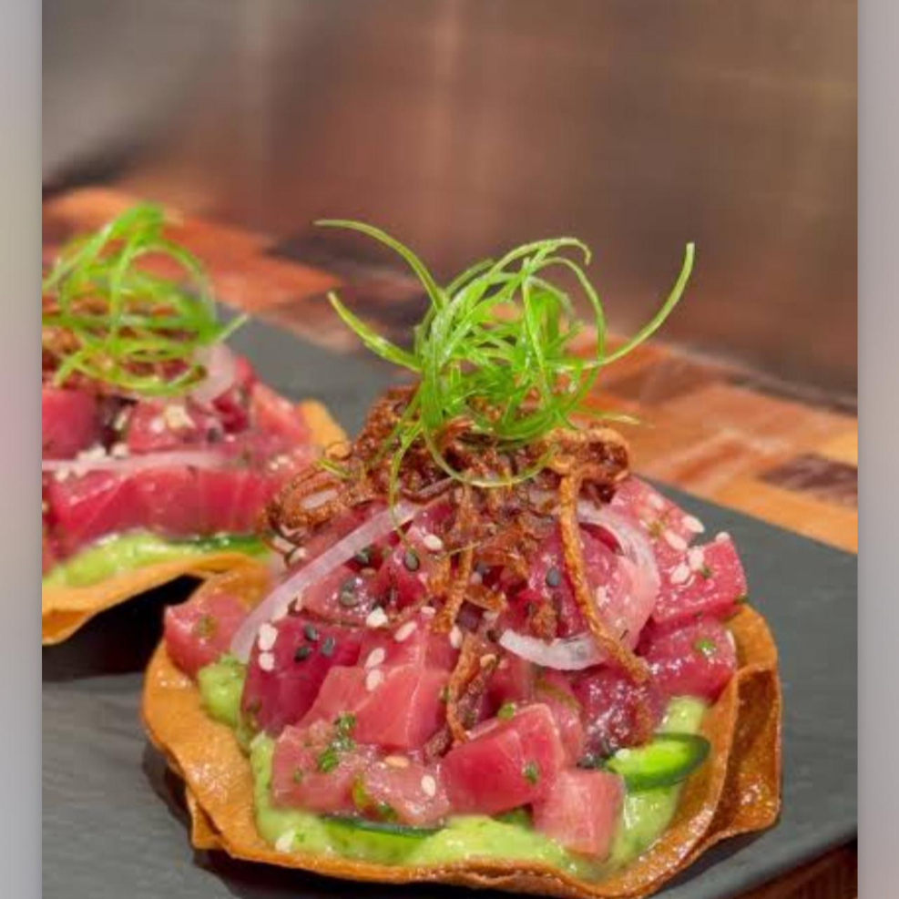 bace de arroz, queso crema, aguacate, atun y adereso chipotle