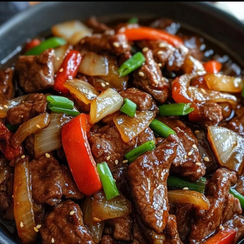 trozos de res crujientes ,zanahoria, pimientos, cebolla cambray en una salsa hunan