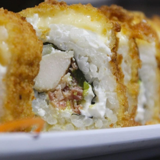 camaron, queso crema y aguacate (rollo caliente) por fuera camarones capeados