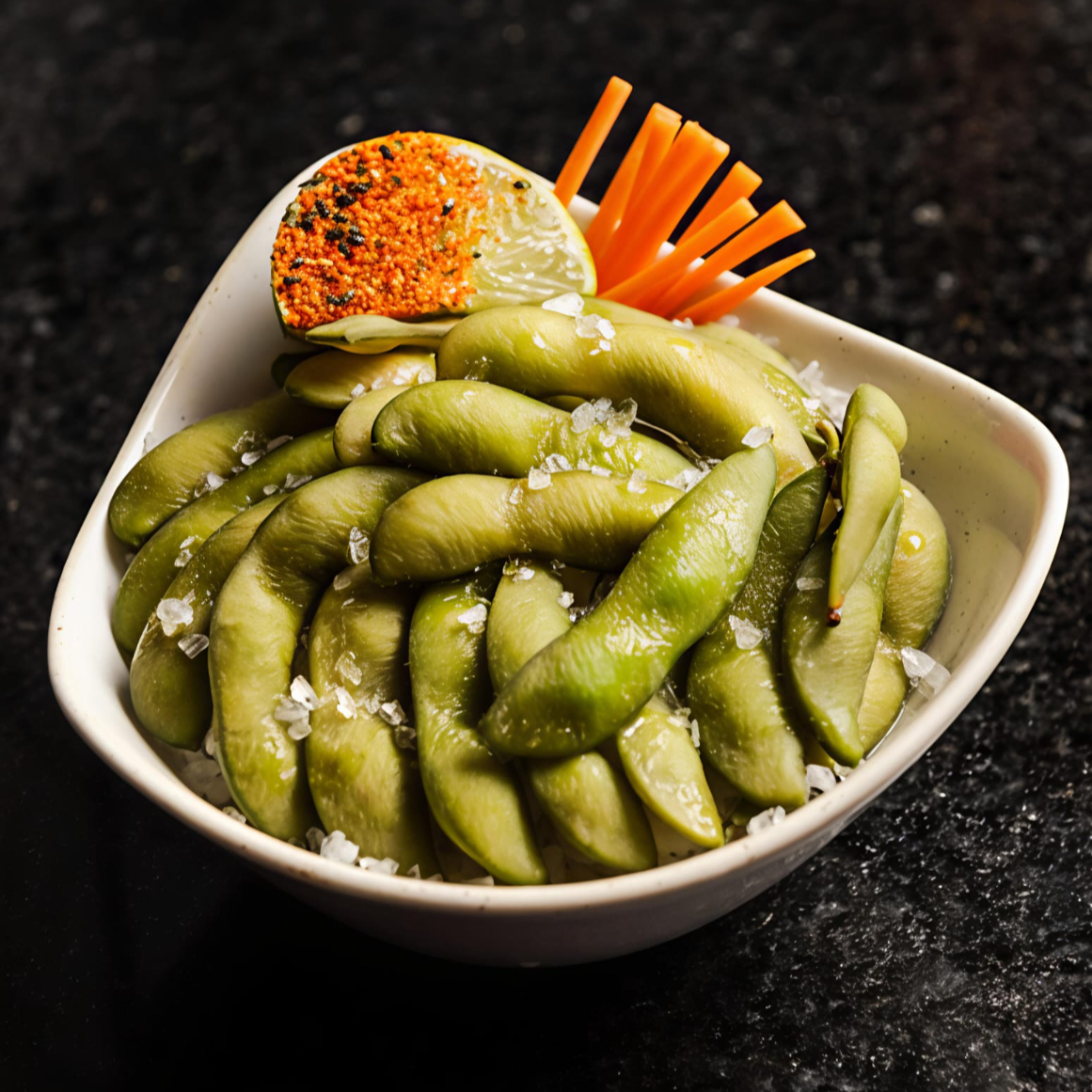 vainas de frijoles de soya al vapor. toque de sal, togarashi y limon