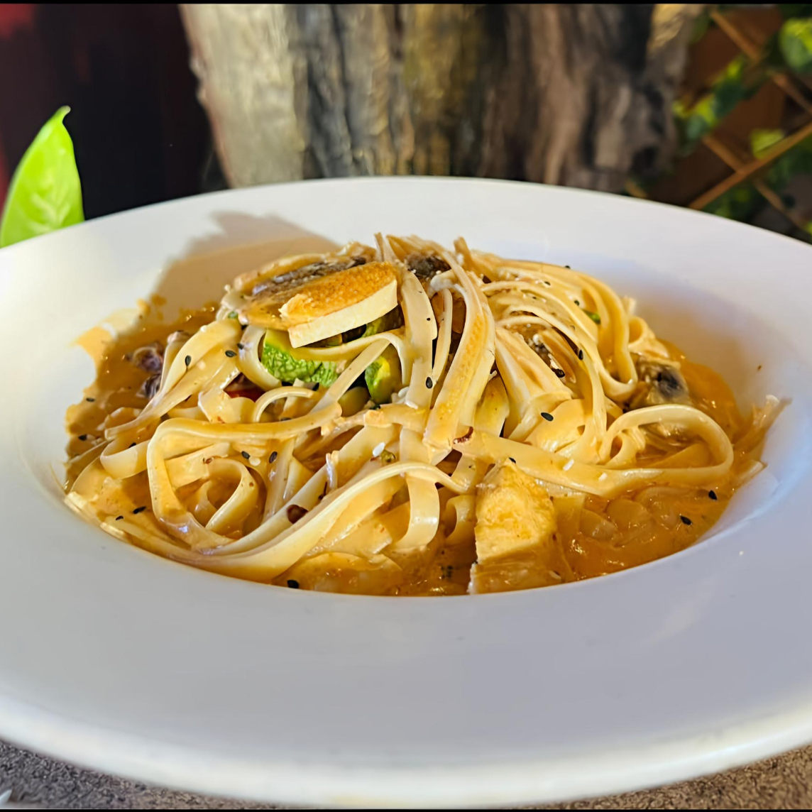 zanahoria, brocoli, piminetos, pollo capeado en una salsa cremosa con un toque de picante