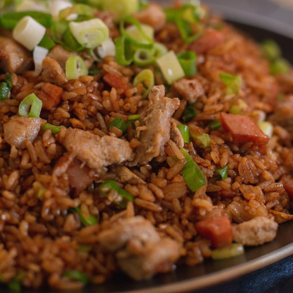 cuatro porciones de arrozes frito mixtos llevan , pollo, carne y camaron y cuatro sushis a elegir
