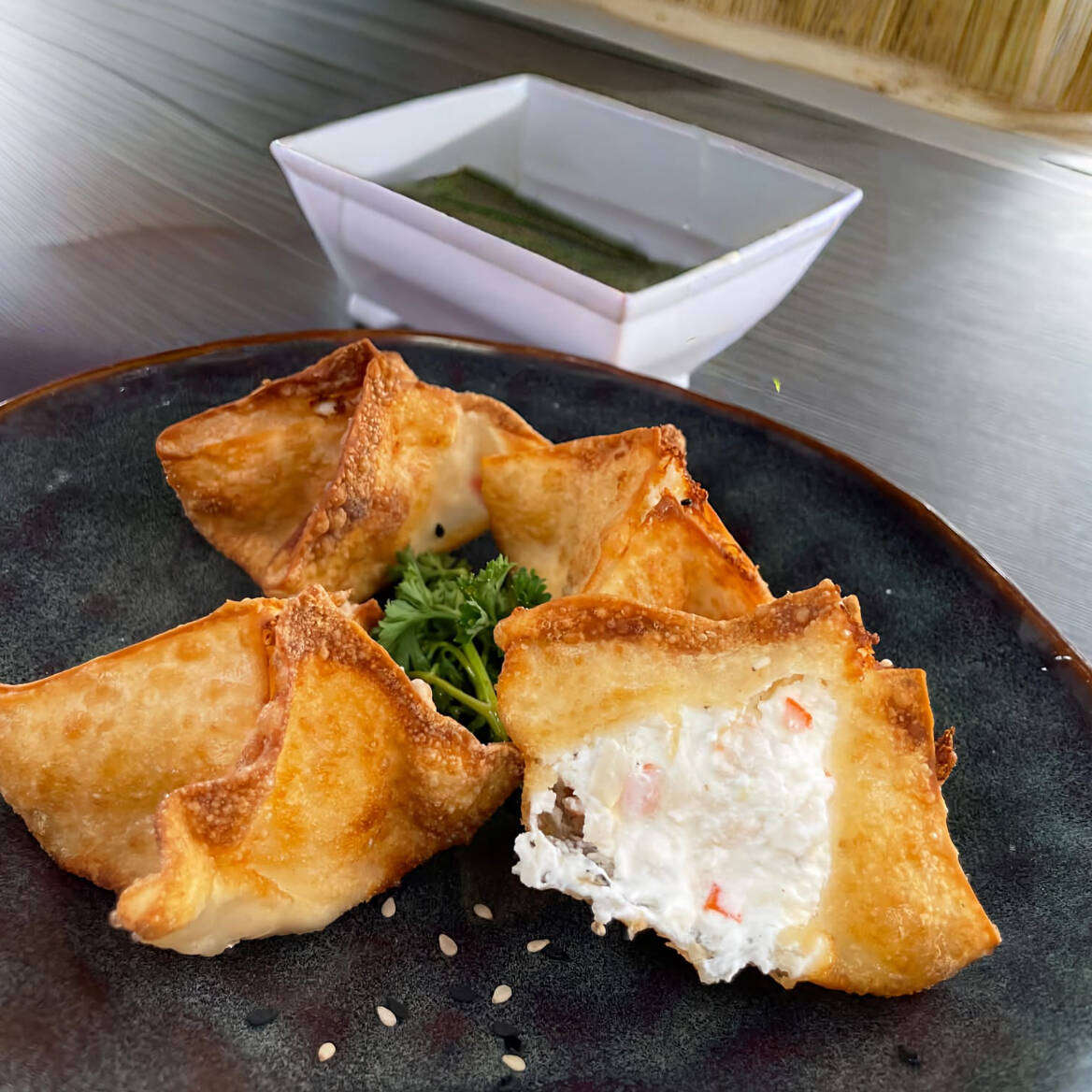 por dentro surimi, camaron y aguacate, por fuera queso manchego con salsa spicy