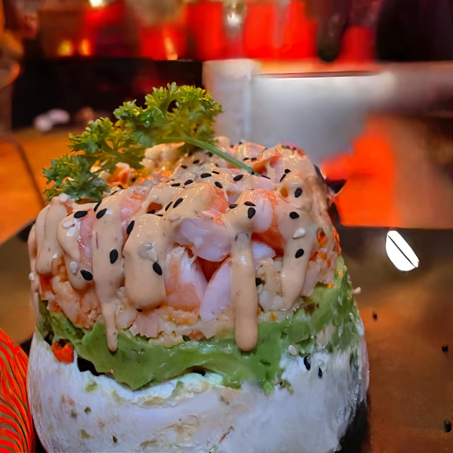 bace de arroz, queso crema, aguacate , camaron y adereso chipotle
