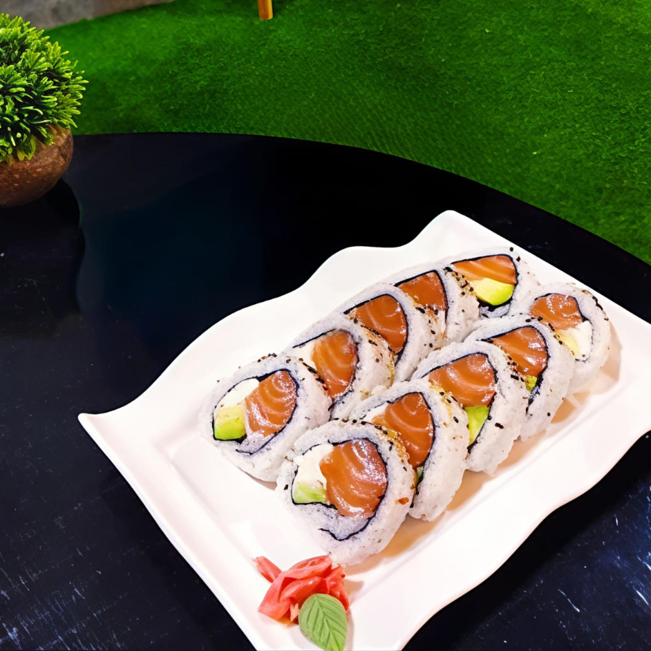 queso crema y aguacate, por fuera salmon ( rollo frio )