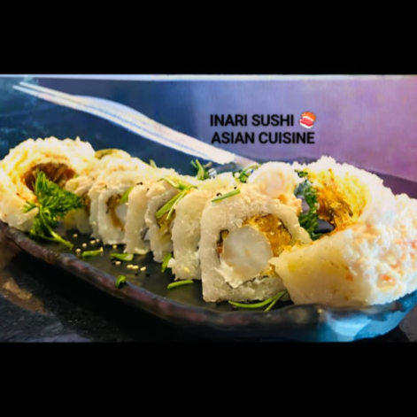 arroz frito, queso crema, camaron, y aguacate, ppor fuera capeado con camarones roca