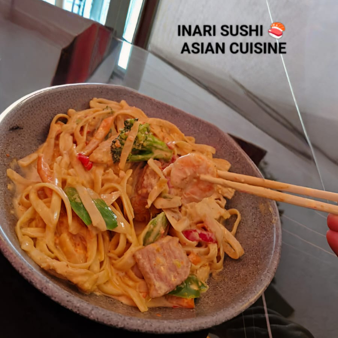 pimientos, zanahoria, brocoli, pollo carne y camaron en una salsa de spicy cremosita