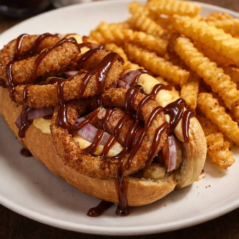 salchicha con tocino ,aros de cebolla, bbq