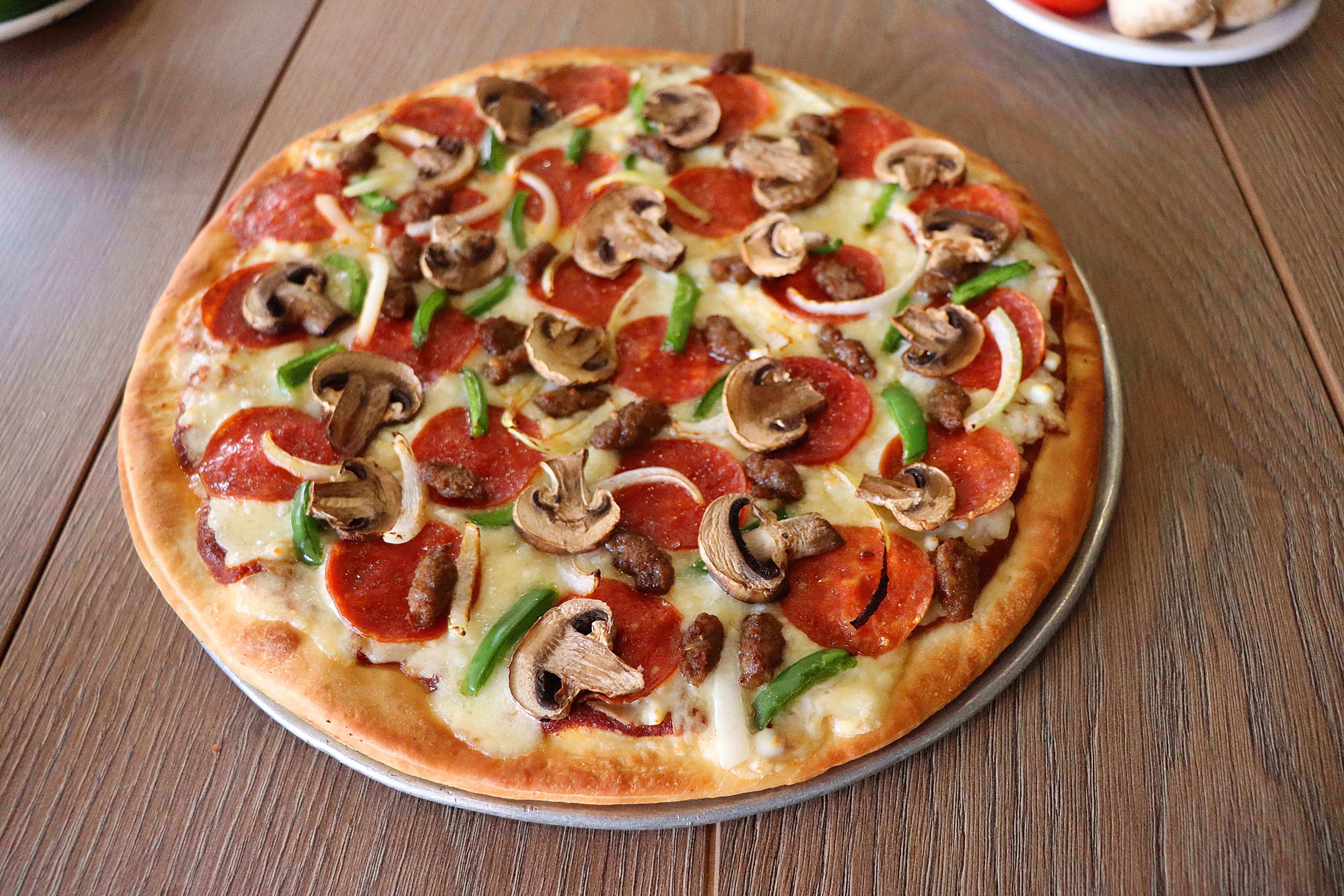 Champiñon, pepperoni, Salchicha italiana, pimiento verde y cebolla, 12"