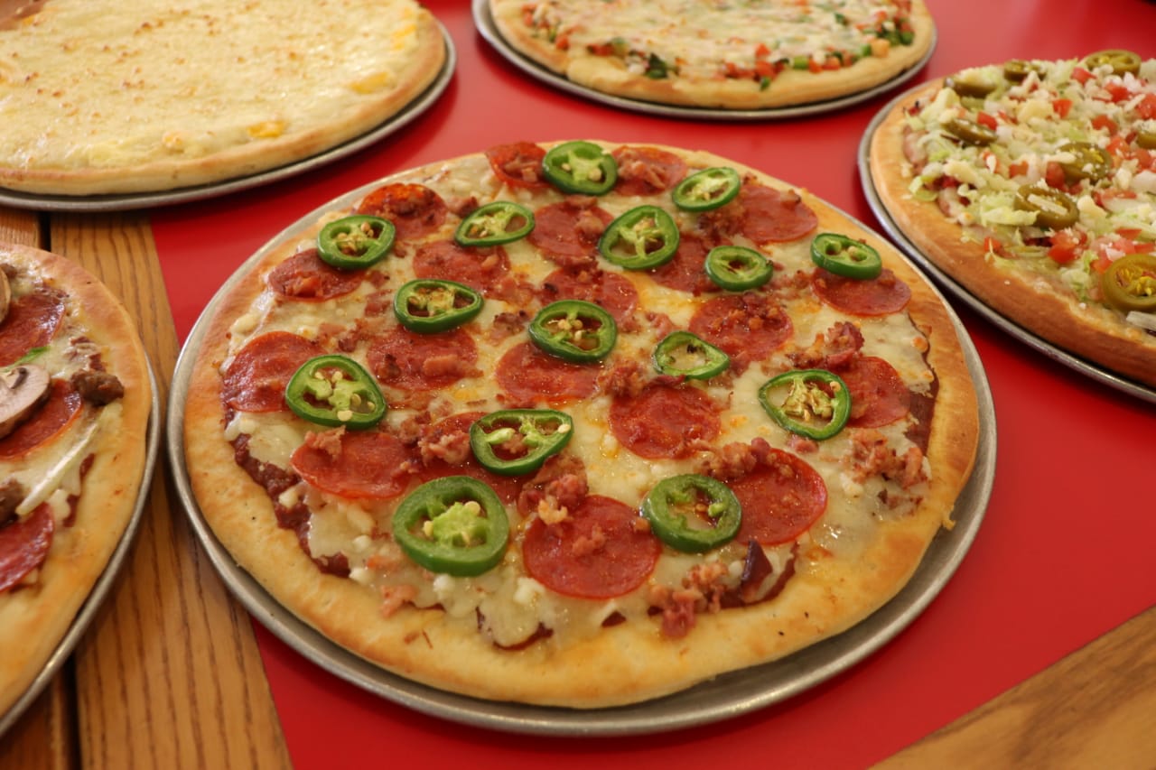 Sin salsa de tomate, doble queso, pepperoni, tocino y jalapeño, 12"